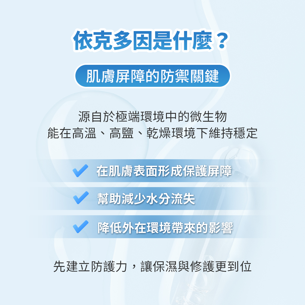 依克多因可在肌膚表面形成一層穩定的保護環境,減少外在環境因素(如乾燥、溫差或日曬)對肌膚帶來的影響,讓膚況更穩定,日常保養也更容易發揮效果(2)。