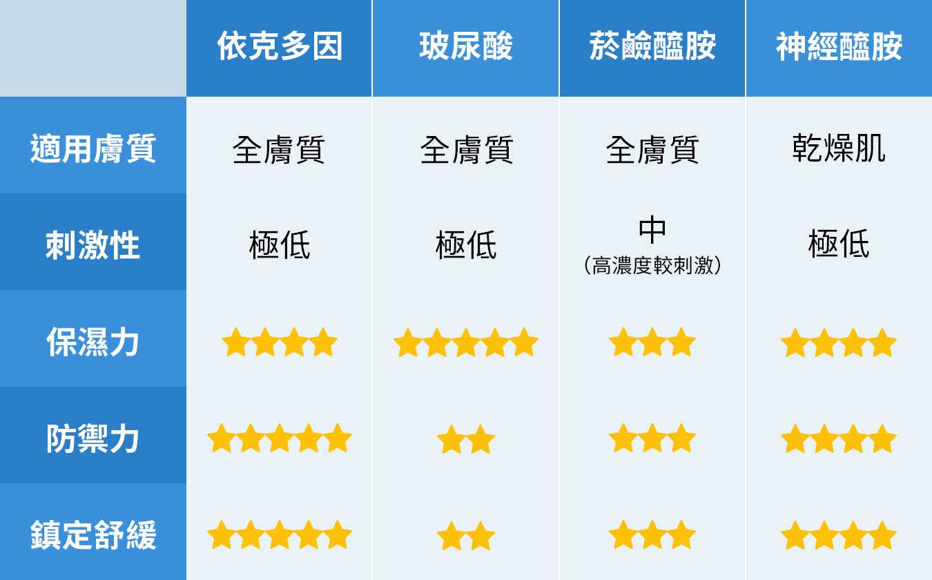 依克多因偏向「穩定型保養」,著重於維持肌膚在環境變化下的舒適度;玻尿酸則是「補水型成分」,能快速為肌膚帶來水潤感;而神經醯胺則屬於「鎖水型脂質」,幫助減少水分流失、提升滋潤度;菸鹼醯胺則是著重「油水平衡」的調理,比較多功能型。