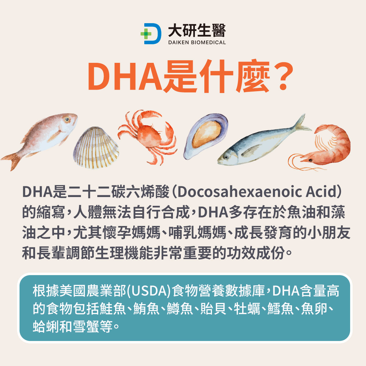 DHA來源可以來自深海魚類、海鮮以及藻類,根據美國農業部(United States Department of Agriculture, USDA)食物營養數據庫,DHA含量高的食物包括鮭魚、鮪魚、鱒魚、貽貝、牡蠣、鱈魚、魚卵、蛤蜊和雪蟹等(2)。但會特別提醒懷孕媽媽從大型魚類攝取足夠DHA,要特別注意重金屬汞的污染問題。