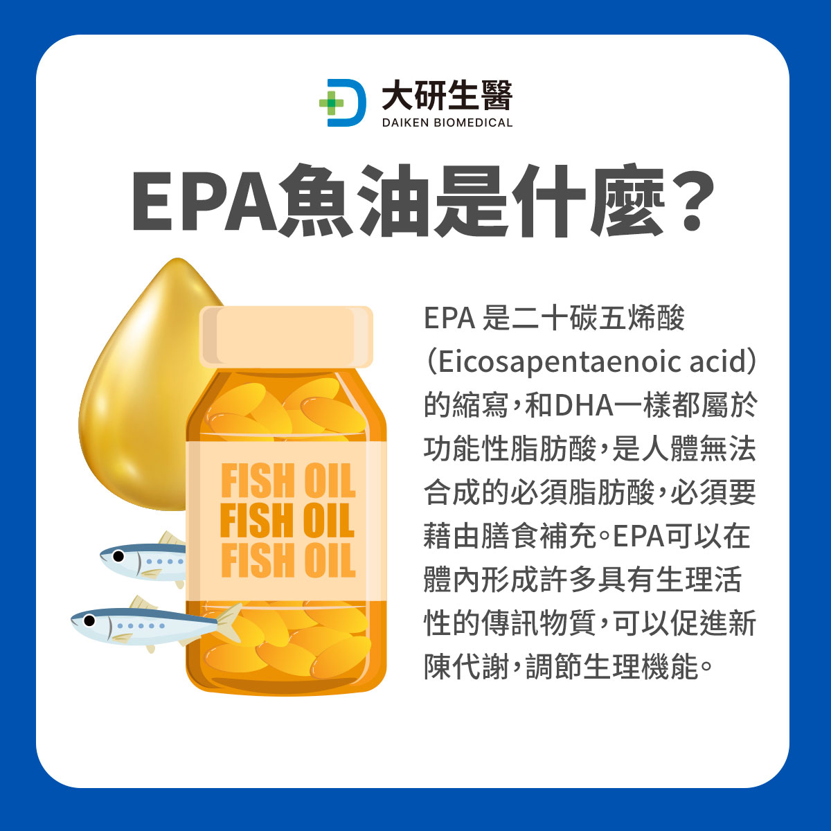 EPA 是二十碳五烯酸(Eicosapentaenoic acid)的縮寫,和DHA一樣都屬於功能性脂肪酸,而生成EPA和DHA的來源脂肪酸皆屬於必需脂肪酸,皆為人體無法合成,因此必須要藉由膳食補充而來。EPA和DHA有許多相似之處,也有各別不同調節生理機能的作用。EPA可以在體內形成許多具有生理活性的傳訊物質,與促進新陳代謝,調節生理機能,對於維持健康有很大的貢獻(1)。